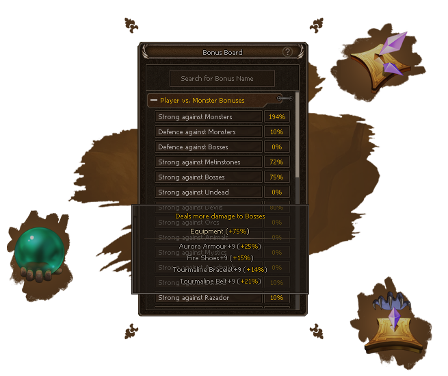Do you want to know the summary of a bonus you have? No problem, you can check the total value of each bonus through our bonus board, but that`s not all! You can also track exactly which item or system contributed to each part of your total bonus value.