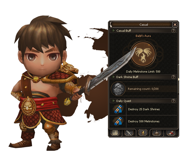 Enable the Casual Buff whenever you want. Once enabled, you can only farm a limited amount of Metinstones per day, but you get an additional boosting daily quest, 40% Dungeon Cooldown Reduction, and guaranteed 100% drop chance on your first 200 Dark Shrine Fragments each day. If you`re a real casual player, you`ll never hit the cap anyway, only grinders do. So there`s no downside to enabling it, just benefits that make your time more rewarding.