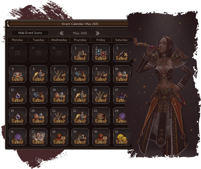 Everyone loves events, so Elveron features daily events with huge variety. Almost every day offers a different side event to keep gameplay fresh. Check the in-game Event Calendar to see all upcoming events and plan your activities.