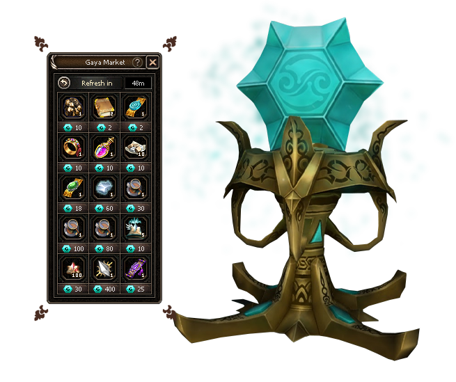 Gaya serves as a second currency with its own dedicated market. What makes it special is the automatic rotation every 12 hours, plus the option to manually refresh a few additional times using a special item.