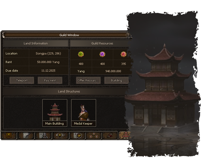 Purchase your own Guild Land and transform it into a thriving hub. Place objects, add essential NPCs, and manage everything conveniently through your guild interface.