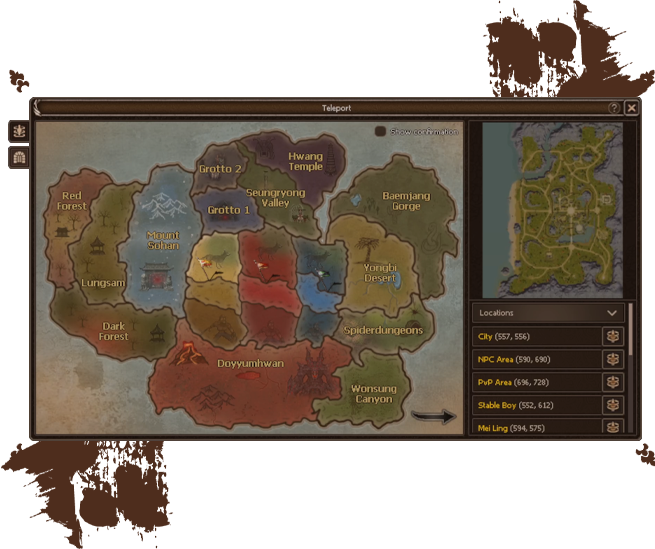 The dedicated Teleport Map provides maximum convenience and serves as an essential tool for navigating Elveron. Preview boss and metinstone locations across all maps, then instantly teleport to your chosen destination with multiple pre-set spawn points available on each map.
