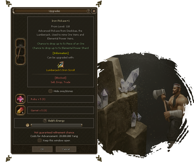 Mining plays a significant role in Elveron`s gameplay. After each mining animation, there`s a chance to drop a Piece of an Ore. With a Pickaxe and Mining Passive Skill, you can increase the amount of Ore Pieces obtained. In the Elemental Realm, special Ore Veins are the main source for Elemental Potions that increase your damage against Elemental Metinstones.