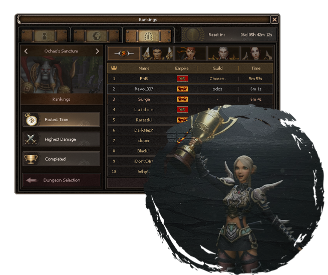 Rankings provide essential metrics to assess your current standing in the game. Compete against other players across multiple categories, including specialized dungeon rankings that showcase your combat proficiency.