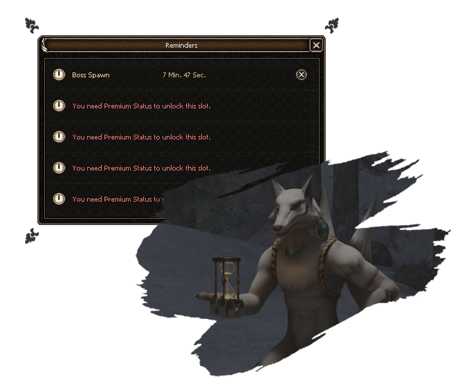 Did you miss important boss spawns in the past? Those days are over. Our customizable Reminder System sends both visual notifications and audio alerts to ensure you`re always ready.