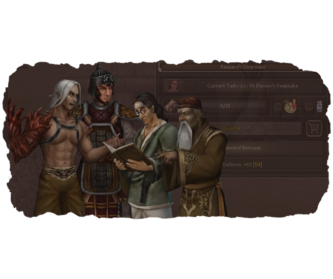 Throughout your adventure, you`ll encounter various Researcher Quests from different NPCs. Help them complete their research to earn permanent bonuses and Ebony Boxes with useful item rewards. Casual-friendly feature: Waiting times for early Researcher Quests are very low to ensure fast progress toward the more rewarding higher levels.
