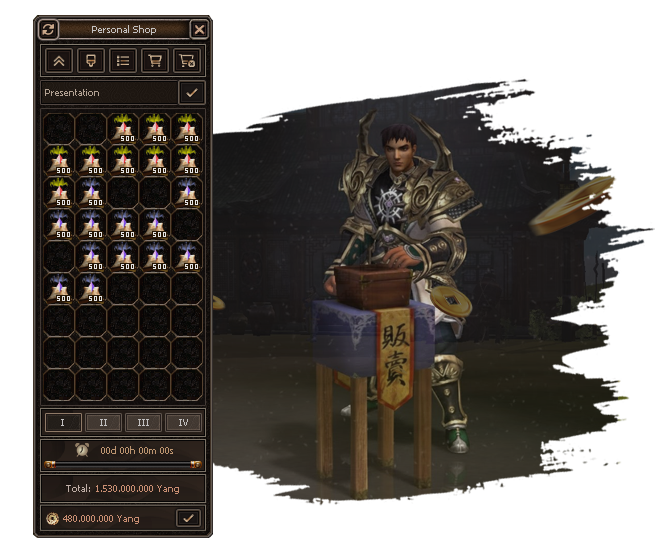 Personal Shop is your gateway to earn Yang. Obtain Offline Time through activities or simply buy it for Yang. The Personal Shop comes with all possible Quality of Life features you can think of. You receive real-time notifications when you sell an item. When items sell while you`re offline, you can easily track them in the comprehensive sell history.